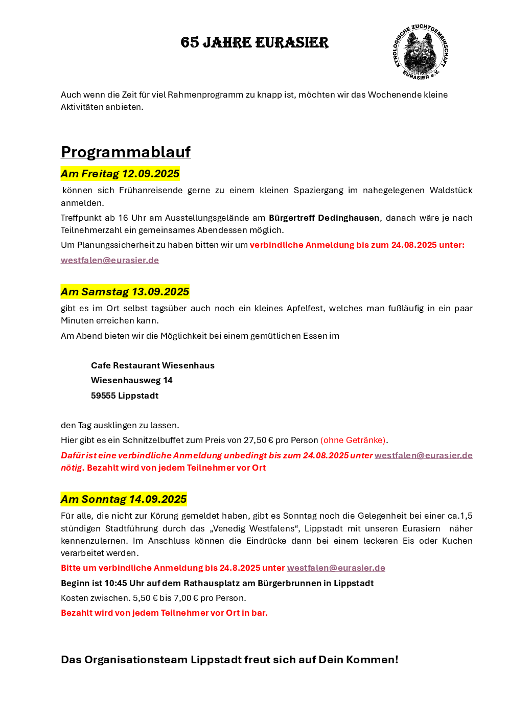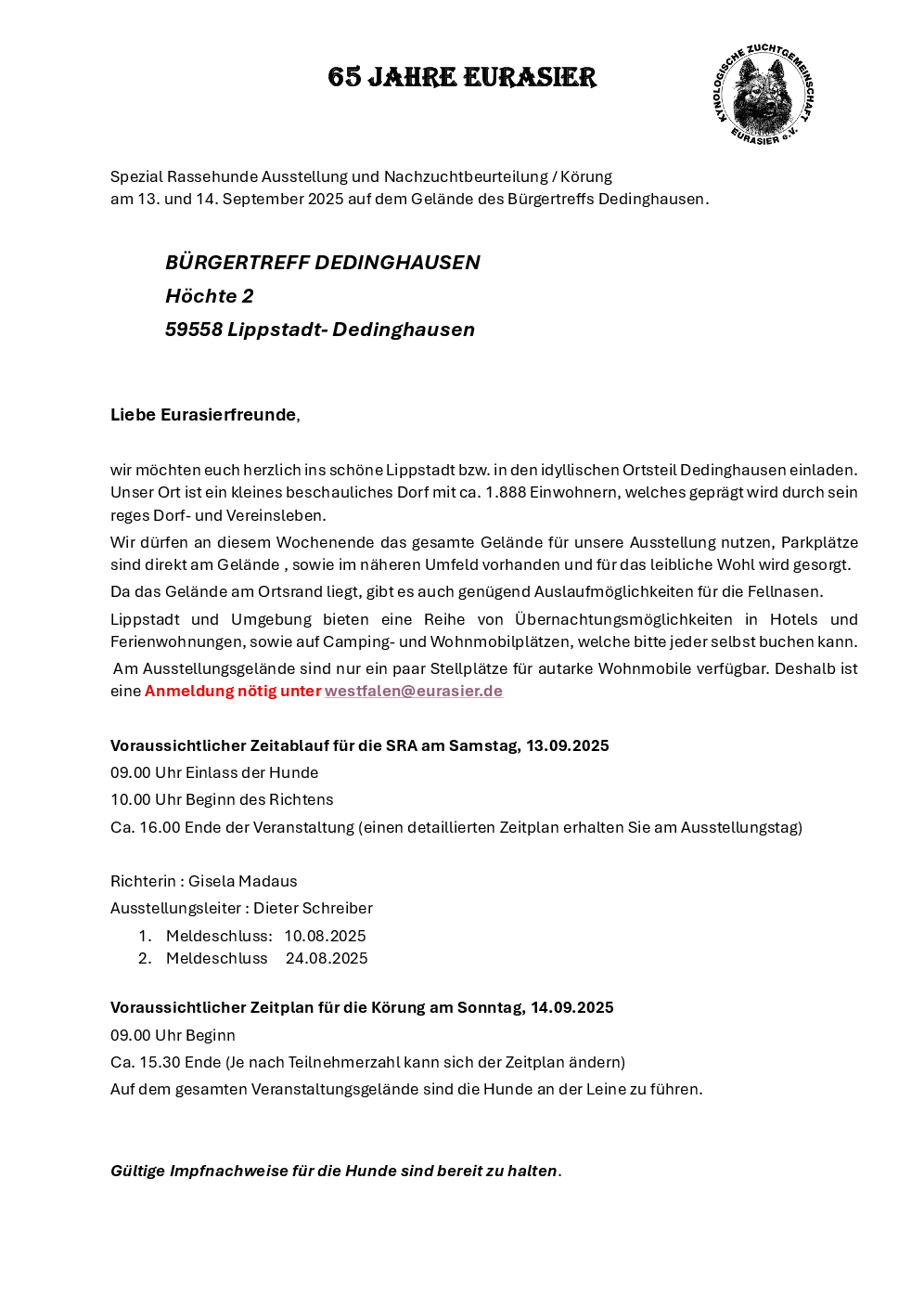 9.00 Uhr: Einlass der Hunde 10.00 Uhr: Beginn des Richtens 16.00 Uhr: Ende der Veranstaltung (Die Zeiten können je nach Meldezahl und individuellen Gegebenheiten abweichen.) Einen Ausstellungskatalog mit detaillierten Zeitplan erhälst Du am Ausstellungstag. Bitte beachte auch die Informationen auf deiner Meldebestätigung!