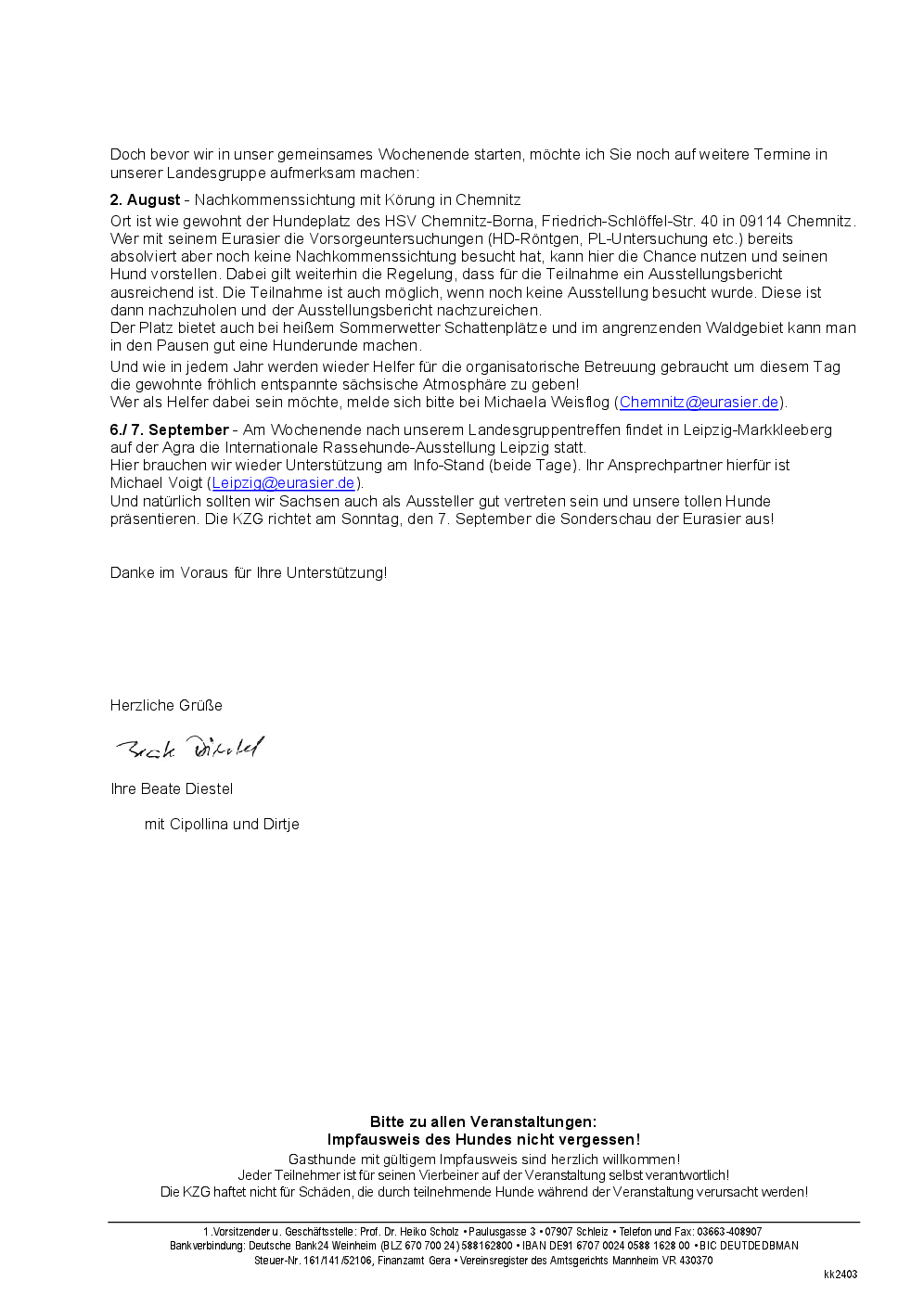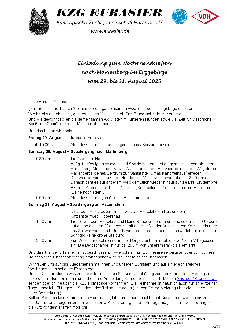 Reservierung unter dem Kennwoer 'KZG Eurasier'.