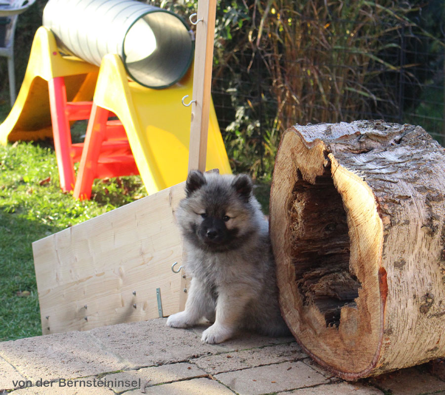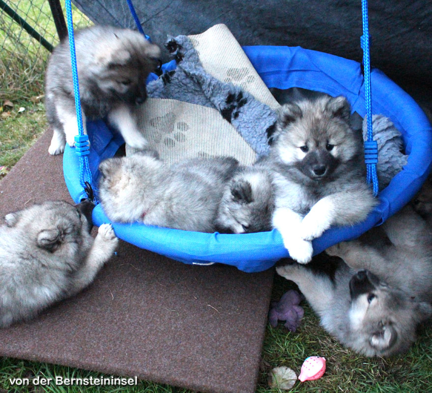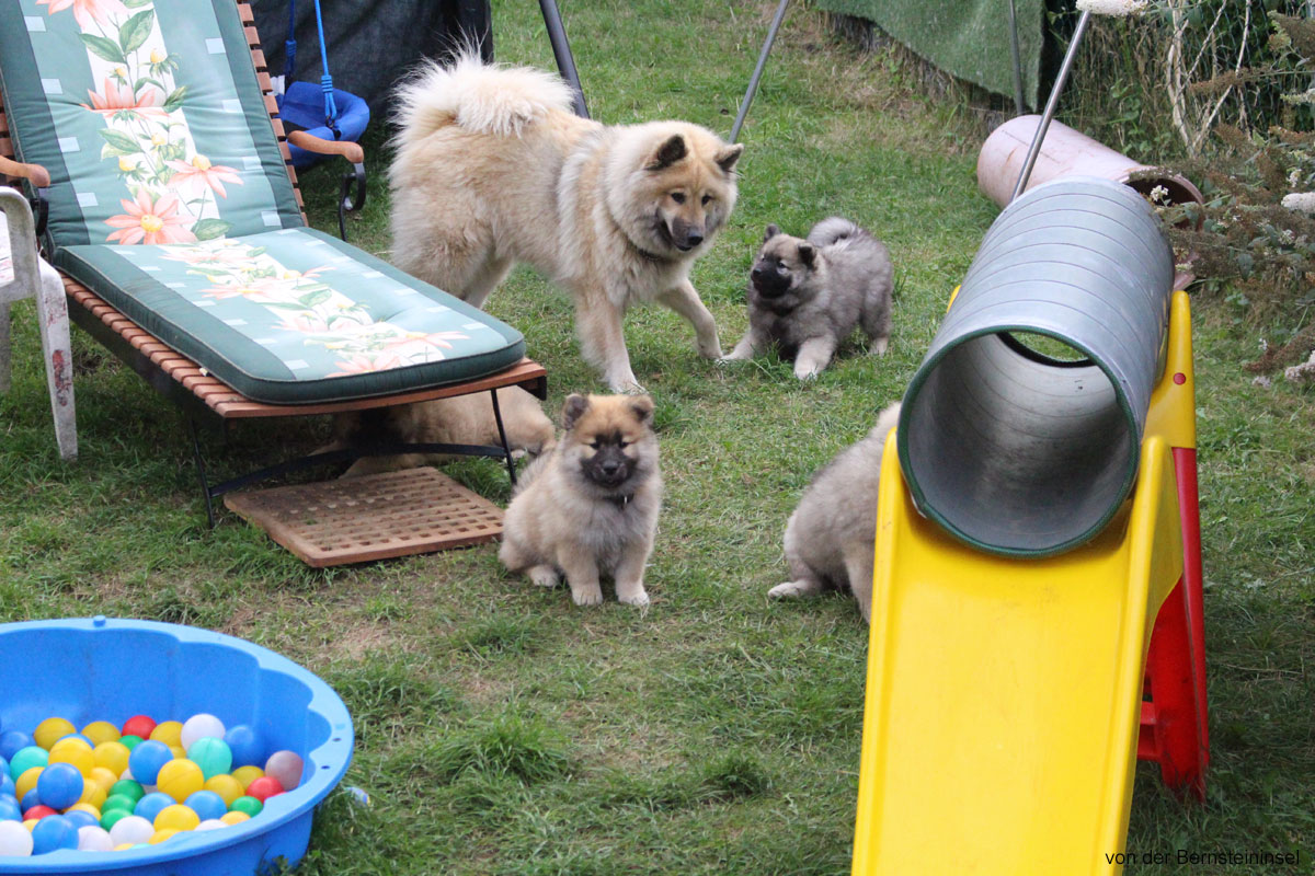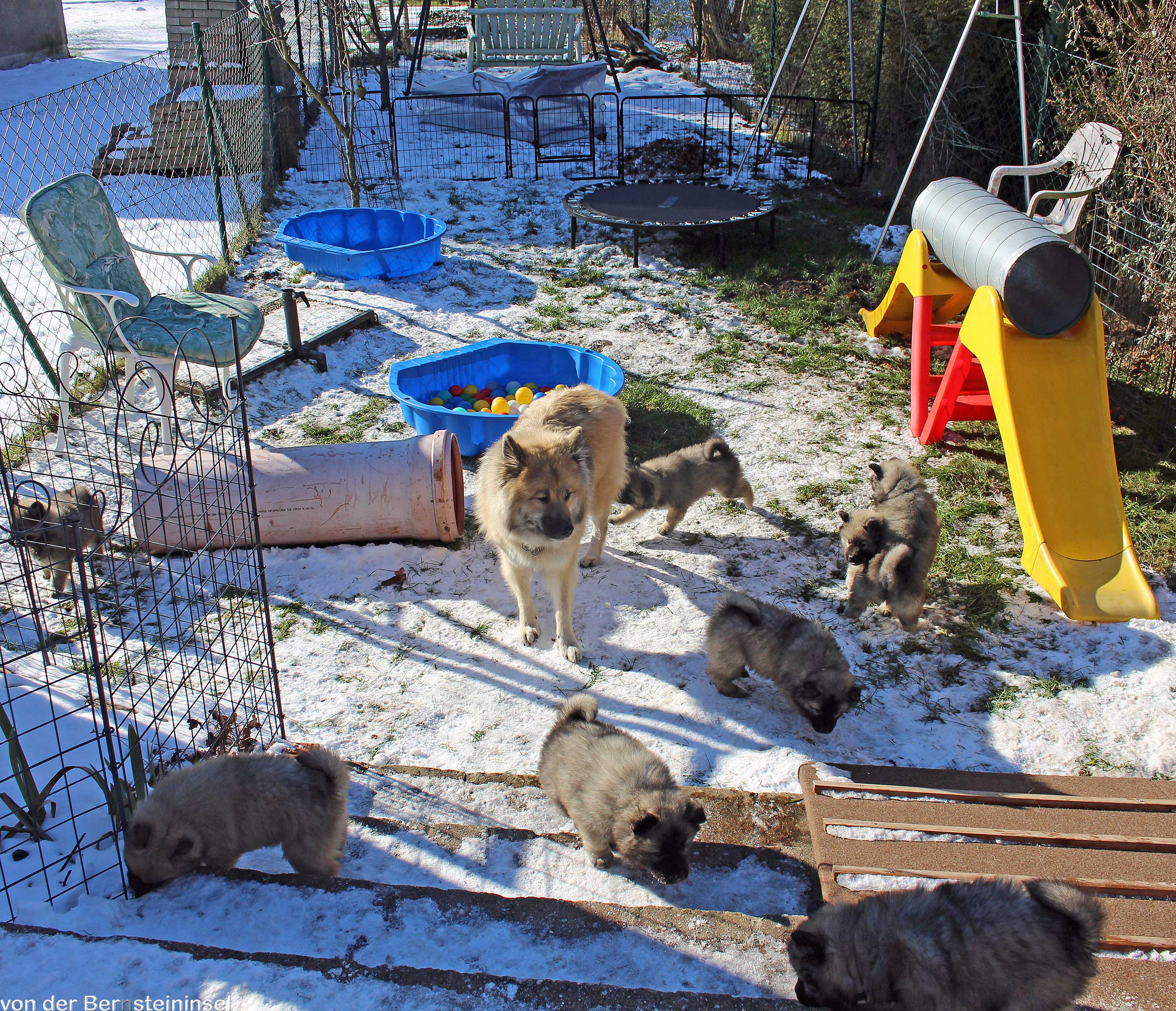 Unsere Welpen werden liebevoll rund um die Uhr von uns betreut. Die Welpenkiste befindet sich in unserem Schlafzimmer. Nach kurzer Zeit erfolgt dann dort eine Vergrößerung der Welpenkiste. Nach ca. 3 Wochen ziehen die Welpen dann in ein separates Welpenzimmer mit Ausgang auf die Terrasse und Garten um. Dann können sie tagsüber den Garten und nachts das Welpenzimmer nutzen. Als Spielgeräte dienen ihnen neben Kleinspielzeug an Seilen diverse Tunnel, Wackelbretter und -scheiben, sowie eine Nestschaukel und eine Rutsche, die ihnen entsprechend ihres Entwicklungsstandes so nach und nach zur Verfügung gestellt werden. In der letzten Woche können sie an einer riesigen Wurzel ihre Zähne reiben, was sie besonders genießen.