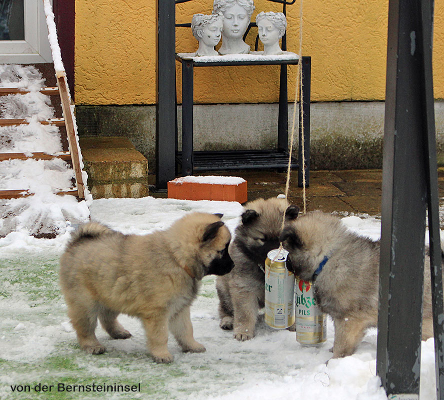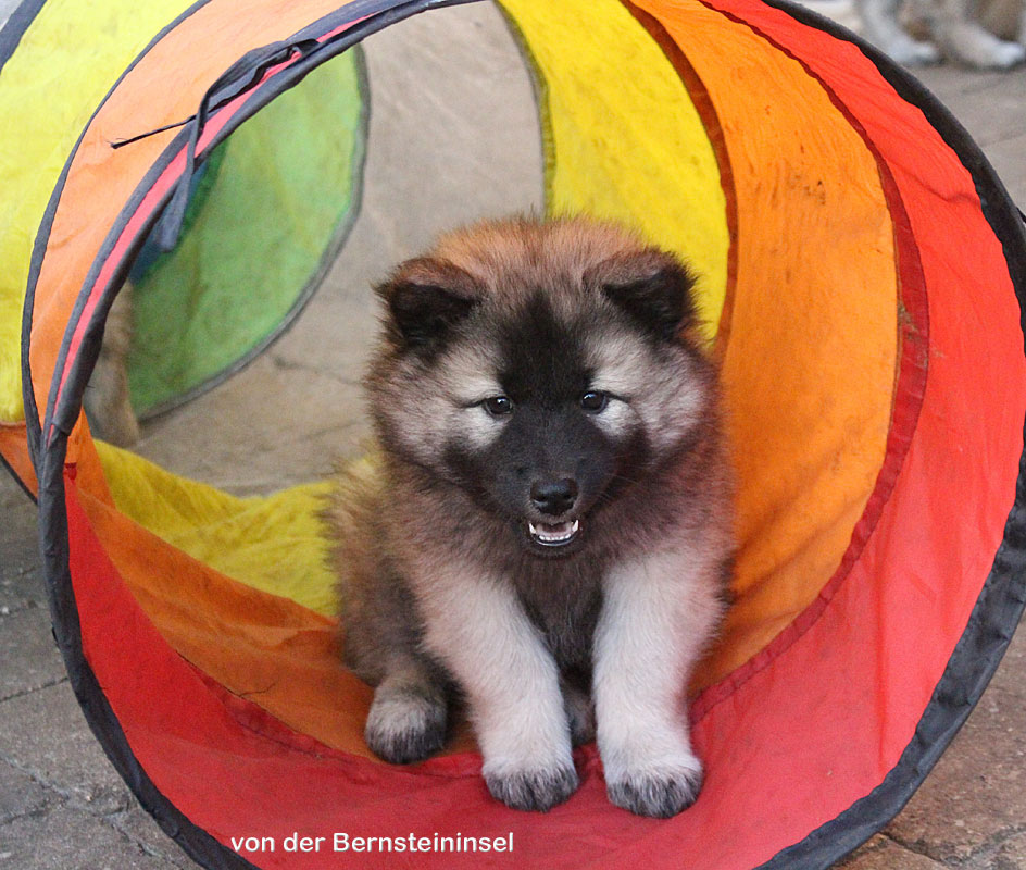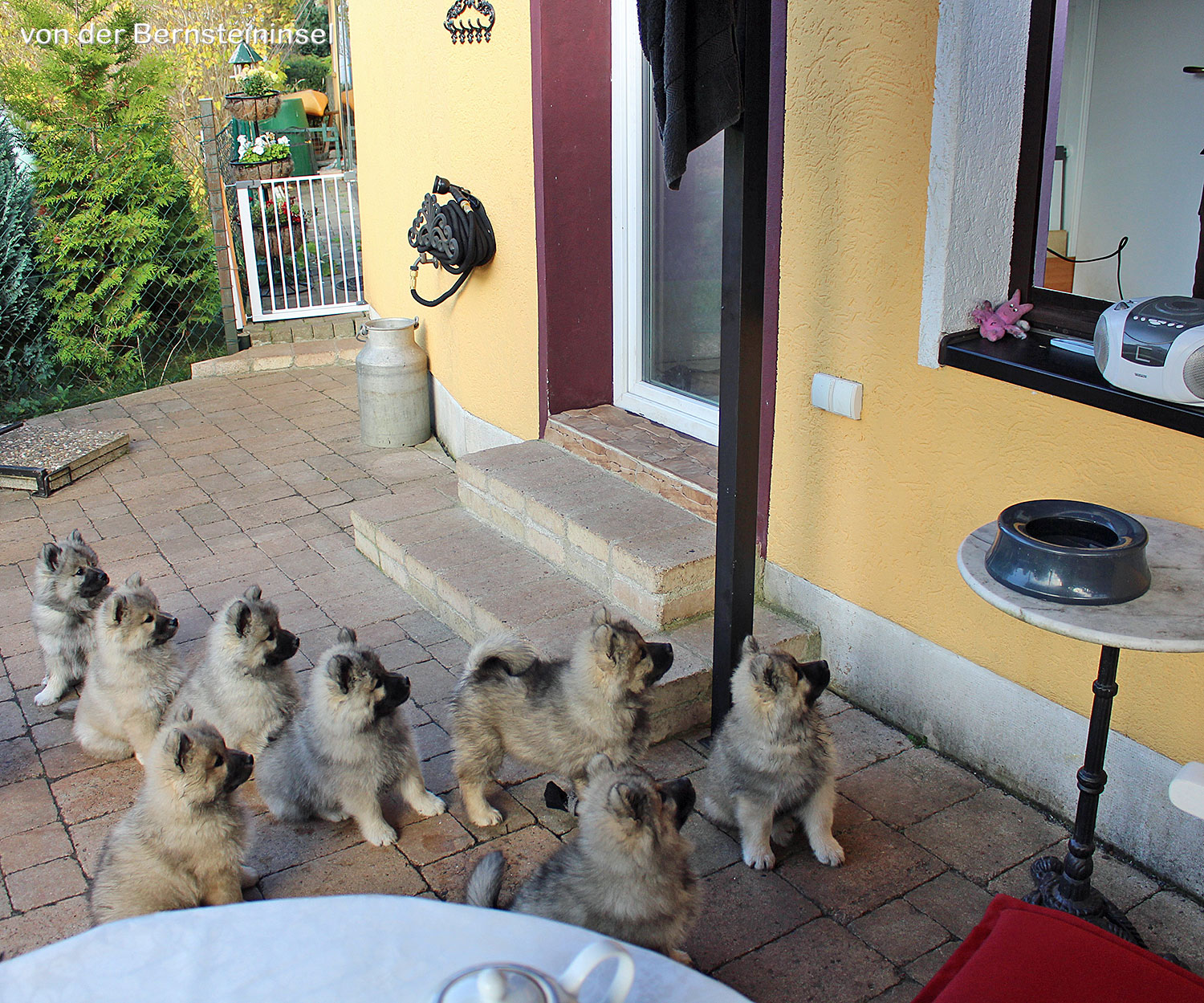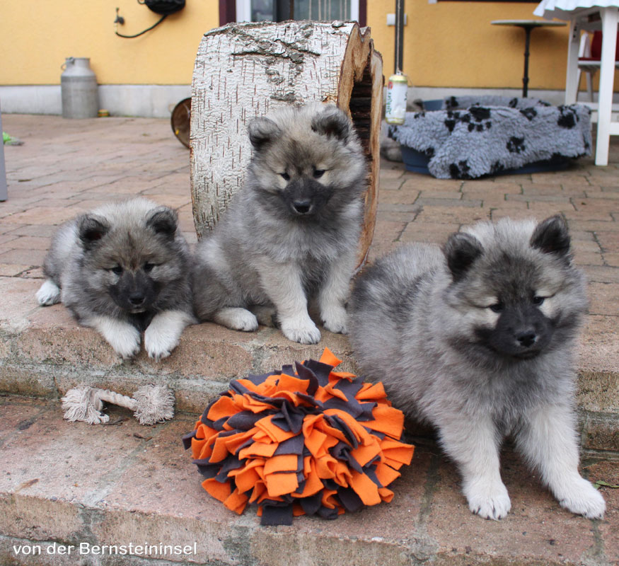 Unsere Welpen werden liebevoll rund um die Uhr von uns betreut. Die Welpenkiste befindet sich in unserem Schlafzimmer. Nach kurzer Zeit erfolgt dann dort eine Vergrößerung der Welpenkiste. Nach ca. 3 Wochen ziehen die Welpen dann in ein separates Welpenzimmer mit Ausgang auf die Terrasse und Garten um. Dann können sie tagsüber den Garten und nachts das Welpenzimmer nutzen. Als Spielgeräte dienen ihnen neben Kleinspielzeug an Seilen diverse Tunnel, Wackelbretter und -scheiben, sowie eine Nestschaukel und eine Rutsche, die ihnen entsprechend ihres Entwicklungsstandes so nach und nach zur Verfügung gestellt werden. In der letzten Woche können sie an einer riesigen Wurzel ihre Zähne reiben, was sie besonders genießen.