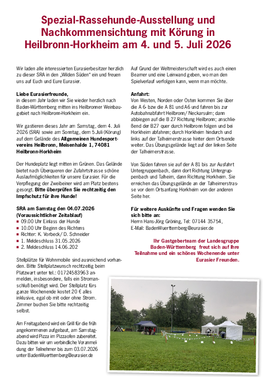 Am Vortag findet auf dem gleichen Gelände eine Spezial-Rassehundeausstellung für Eurasier statt.