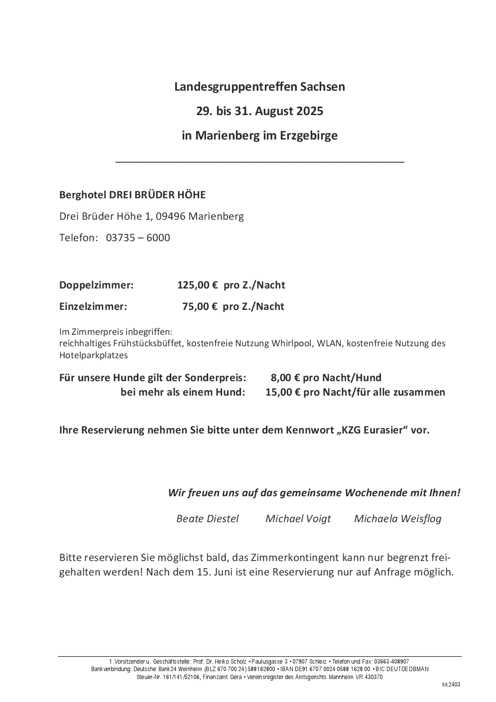 Reservierung unter dem Kennwoer 'KZG Eurasier'.