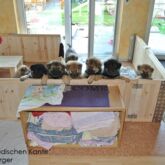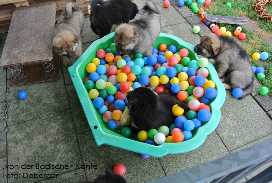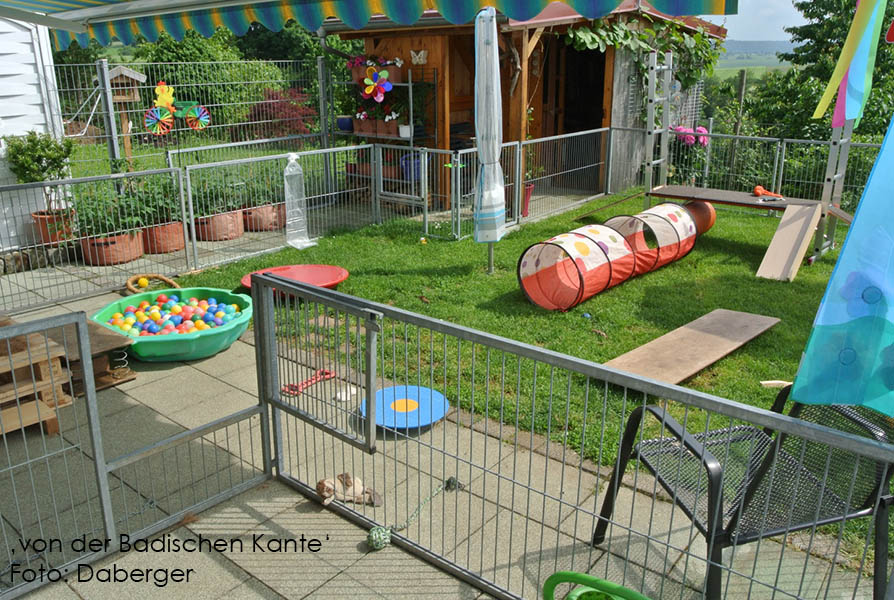 Unsere Wurfkiste steht im Wohnzimmer direkt am Ausgang zur Terrasse und dem angrenzenden Garten. Unsere Welpen wachsen in unserem Haus zwischen der Mutterhündin und unserem Rüden auf. Bei der Aufzucht sind sie im Garten, auf dem Rasen, im Sand, auf Gitterrosten und Holzdielen unterwegs. Rutsche, Wackelbrett, Kistenlabyrinth, Tunnel, Wasser- und Bällebad, Flatterbänder und Zerr- und Reißspielzeug gehören zum abwechslungsreichen Spielplatz. Ein Besuch in der Kindertagesstätte oder von den Kindern in der Zuchtstätte ist für alle ein Erlebnis. Autofahren zum Tierarzt…, Spaziergänge auf der Streuobstwiese und im Wohngebiet gehören zum Programm für unsere Welpen dazu.
