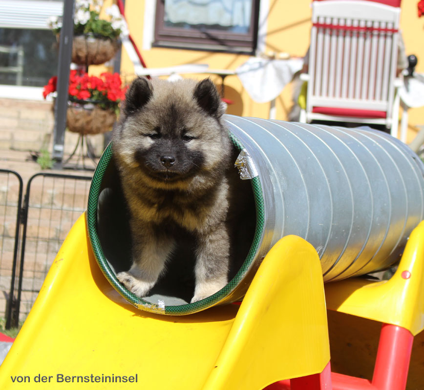 Unsere Welpen werden liebevoll rund um die Uhr von uns betreut. Die Welpenkiste befindet sich in unserem Schlafzimmer. Nach kurzer Zeit erfolgt dann dort eine Vergrößerung der Welpenkiste. Nach ca. 3 Wochen ziehen die Welpen dann in ein separates Welpenzimmer mit Ausgang auf die Terrasse und Garten um. Dann können sie tagsüber den Garten und nachts das Welpenzimmer nutzen. Als Spielgeräte dienen ihnen neben Kleinspielzeug an Seilen diverse Tunnel, Wackelbretter und -scheiben, sowie eine Nestschaukel und eine Rutsche, die ihnen entsprechend ihres Entwicklungsstandes so nach und nach zur Verfügung gestellt werden. In der letzten Woche können sie an einer riesigen Wurzel ihre Zähne reiben, was sie besonders genießen.